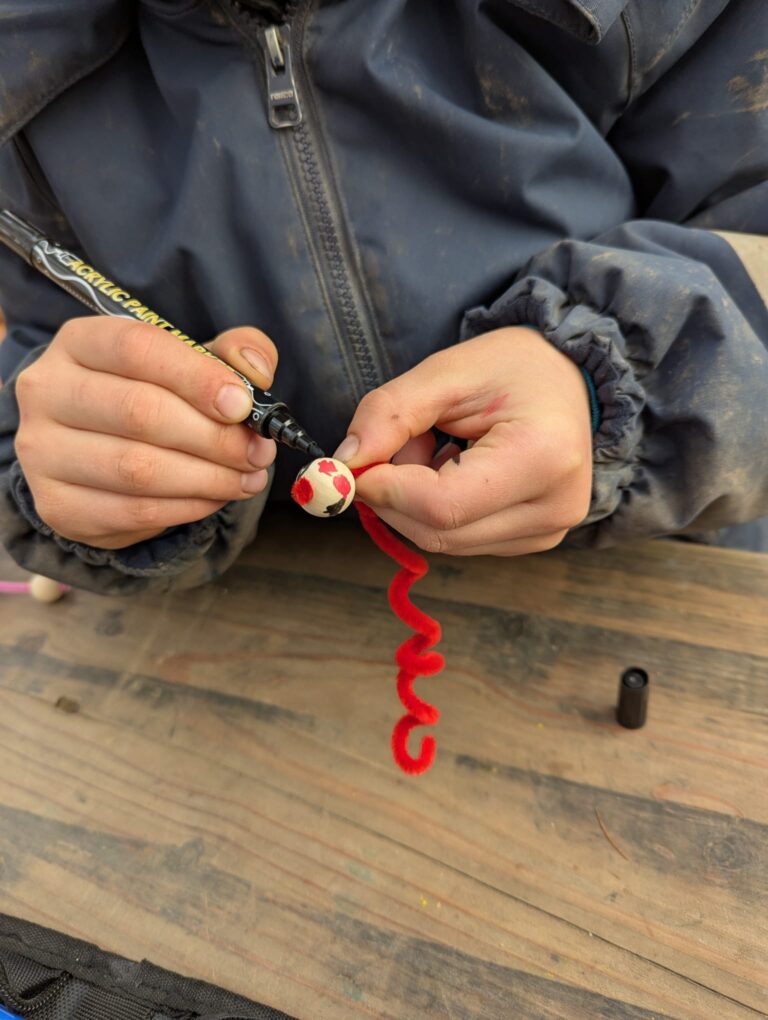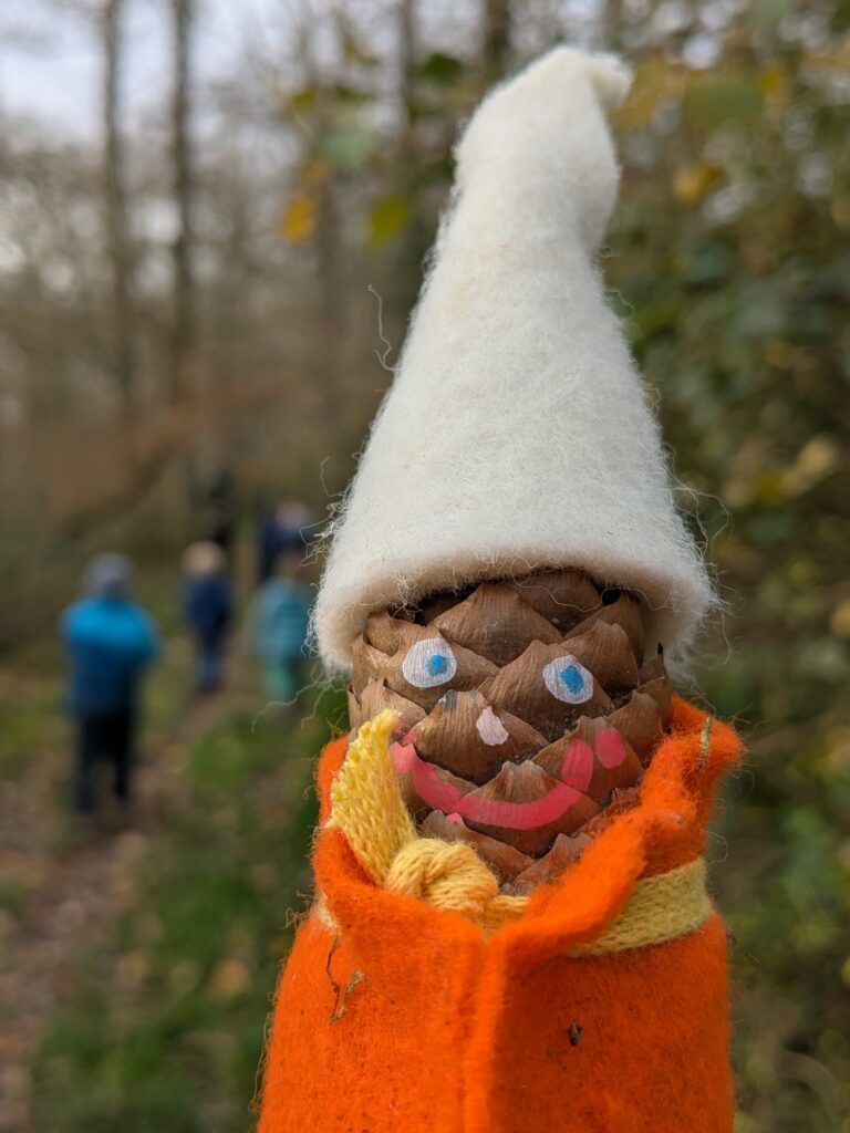 Unser Freund Fridolin, der Zapfen, bekam heute einen neuen warmen Wintermantel sowie eine kuschelige Mütze von uns geschneidert. Er wohnt mitten im Rhenser Wald und wir besuchen ihn und seine Freundin Spinderella regelmäßig. Die Waldkids kamen dann auf die Idee, neue Wichtel bei uns am Waldplatz einziehen zu lassen. Wir bemalten also kleine dicke Äste, tauften die neuen Nachbarn Ivi und Jonas und suchten eine tolle Unterkunft für die beiden. Eine gemütliche Höhle war rasch gefunden. Damit die Wichtel nicht frieren, erhielten sie eine große Haustür. Schaut doch gerne mal bei den beiden vorbei, sie freuen sich immer sehr über Besuch!