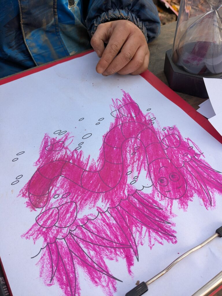 In den Tierischen Wochen beschäftigen wir uns unterschiedlich mit dem jeweiligen Tier. In dieser Woche haben wir den Kindern Ausmalbilder zur Verfügung gestellt und wir haben mit ihnen kleine Regenwürmer aus Holzkugeln und Pfeifenputzern gebastelt. Zudem soll zeitnah noch eine Regenwurmbeobachtungsstation entstehen. Im Mittagskreis singen wir aktuell das Lied „Hörst du die Regenwürmer husten“.