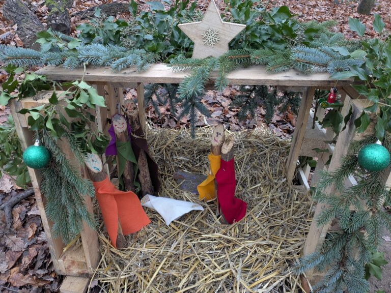 In dieser Woche haben wir gemeinsam mit den Kindern den Stall gebaut, in welchem Maria und Josef Unterschlupf gefunden haben. Herr Hermann Mallmann hat uns freundlicherweise Stroh gespendet, sodass die Heilige Familie es warm und gemütlich hat. Aus zurecht geschnittenen Ästen wurden Maria, Josef, Jesus sowie die Heiligen drei Könige von den Kindern gestaltet. Gerne betrachten die Waldkids den Stall und arrangieren die Figuren um, damit diese beispielsweise auch mal ein Schläfchen im weichen Stroh halten können.