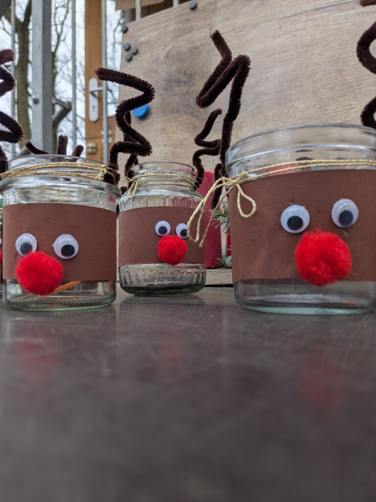 Auch kreativ haben wir uns mit dem Thema Weihnachten beschäftigt. Wir haben aus kleinen Gläsern, Pfeifenputzern, Papier und Wackelaugen lustige Rentiere gebastelt, die von einem Teelicht beleuchtet werden können.