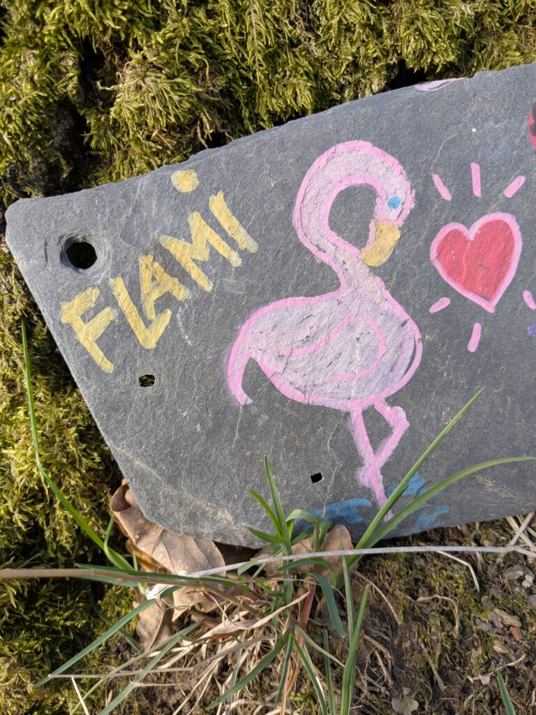 Vor kurzem haben wir einen Platz im Wald aufgesucht, an welchem wir lange nicht gewesen sind. Dort gibt es große Wurzeln, die die Waldkinder optimal mit unserem Werkzeug bearbeiten können. Einmal haben wir dort einen Ast in Form eines Flamingo Kopfes gefunden. So entstand die Namensidee für diesen Ort. Der Stock verbleibt natürlich an einem geschützten Ort, so dass wir ihn immer wieder zum Spielen am „Flamingo Platz“ benutzen können.