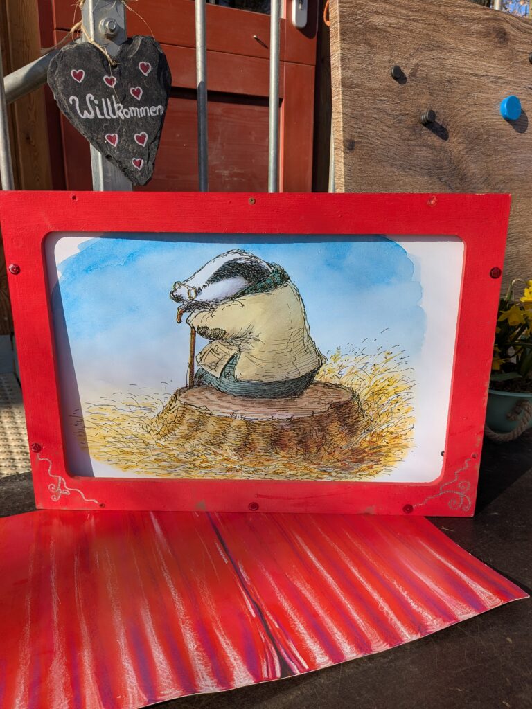 In der Woche vor Ostern haben wir, wie berichtet, das Pflegeheim „Haus Clara“ in Rhens besucht. Wir trafen Menschen mit hohem Alter und, zurück am Waldplatz, kamen wir mit den Kindern auch auf das Thema „Sterben“ zu sprechen. Daher haben wir die Geschichte „Leb wohl, lieber Dachs“ mittels Kamishibai vorgetragen. Denn Sterben gehört zum Leben dazu und ist kein Thema, das wir tabuisieren.
